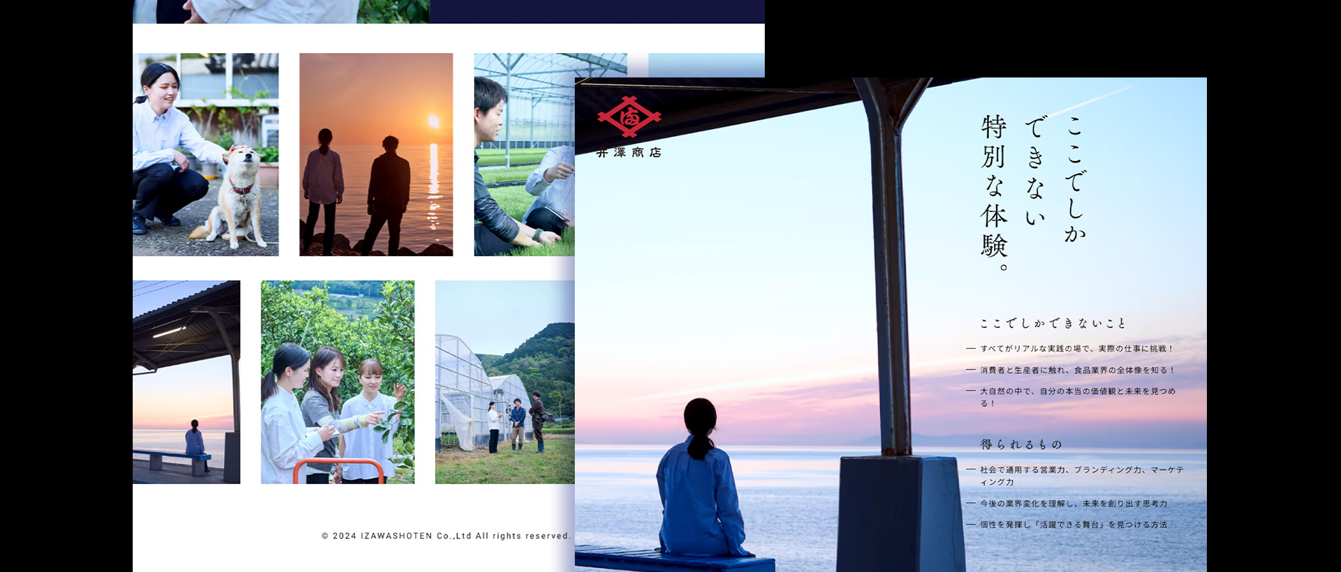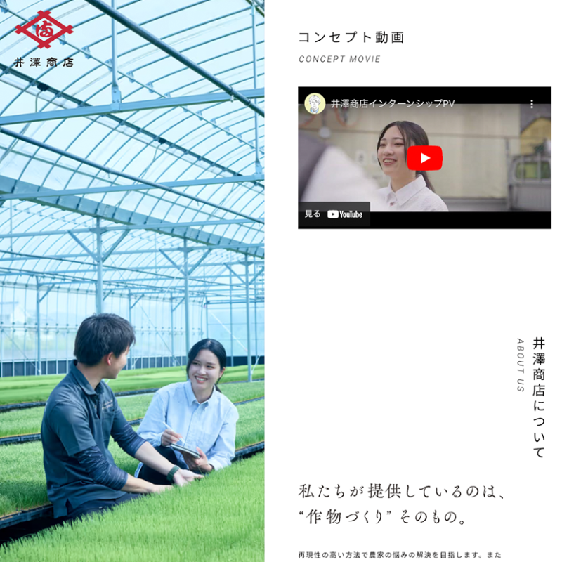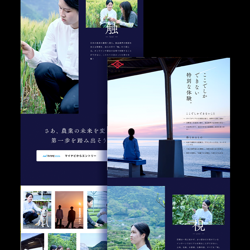 インターンシップの訪問場所や体験内容が一目で分かり、「農業界に変革を起こす」という井澤商店様が掲げるミッションに共感する学生に興味関心を持ってもらえるようなWEBサイトを作りたいとご要望があり、全体のディレクションからスチール撮影まで担当させていただきました。また、井澤商店様はWEBマーケティングにも注力していて、肥料商が持つ従来のイメージを払拭し、農業界に変革を起こす企業であるということや、全国各地を回って土地のものを楽しむ面白さや、農家様との関係性も伝わるようなサイトにしたいとご依頼をいただきました。