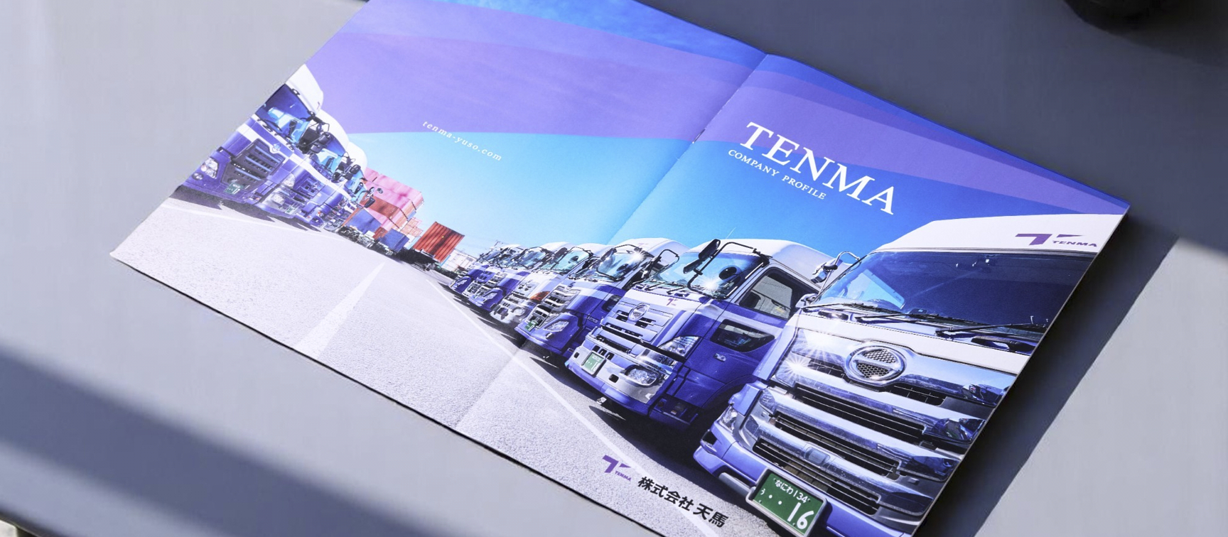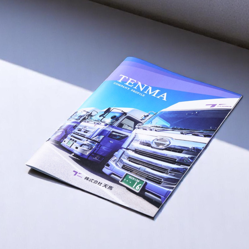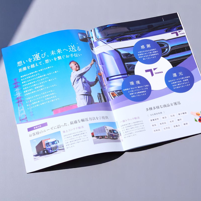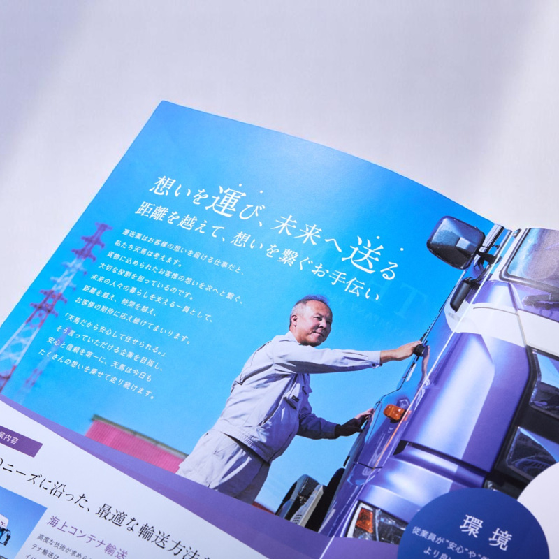 伝えたい内容や見せ方について丁寧にヒアリングを行い、構成の考案からディレクションまで一貫して行いました。撮影では、車両が最も映える時間帯やロケーションを選定し、ご提案させていただきました。制作面では、事業内容やサービスが一目で伝わるよう、コンテナの積み込みから貨物の引き渡しまでの一連の流れを写真やイラストで分かりやすく表現しました。さらに、株式会社天馬様が運送業に込める想いをコピーライティングで届けるなど、ビジュアルから企業の魅力が伝わるパンフレットに仕上げました。